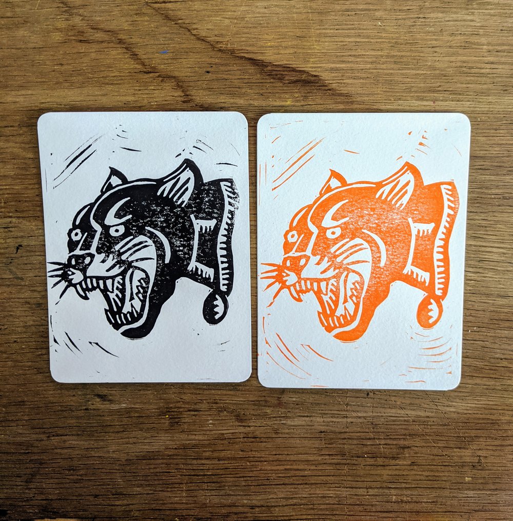 4.5x6" print on 140pt card stock printed in orange or black ink shipped USPS